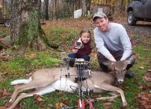 | Nick Merritt, East Fairfield, VT is claiming he shot this doe in Franklin County, VT, October 23, 2011, although Nick's daughter Marianna ( the one holding the scent ) knows she deserves all the credit for collecting this fine Vermont doe. We will let you gentle readers determine the real truth of the matter. |