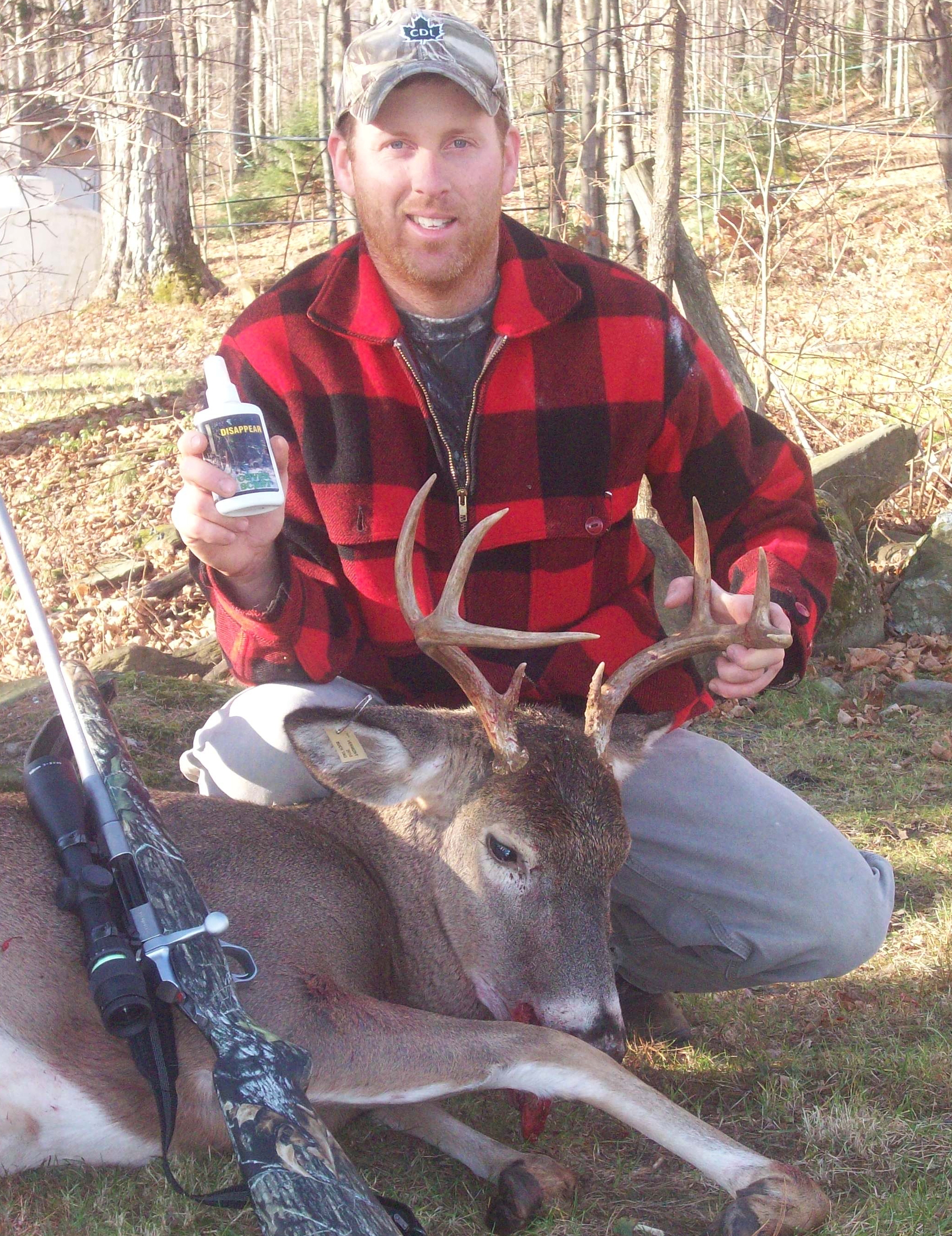 | I bought your Disappear Scent in mid October last year. I just wanted to let you know I'm very pleased with the results. I truly feel that I have not had a deer smell me all year. I had great success last year. I feel your scent has been a big part of my success. The first weekend of our rifle season, the wind blew over 30 mph all weekend and I had deer all over me. The guys at camp were seeing nothing. I saw bucks every day. Thanks for the good scent and I will be reordering again. Also, I tell all the guys in camp about your website. This year I will start bowhunting and I'm very excited to have your sent to use. I feel it will be a big factor in my early bowhunting success. Roy Lovell - Bentonville, AR |
