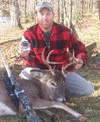 | Hey buddy, well this year has been awesome. So John and I go out together like we often do and he has been a bit sore lately, so still hunting requires a few breaks here and there. We sat down for a few minutes a couple feet apart. All of the sudden, I hear this noise that didn't register at first. It was a buck coming over this ledge grunting every 8-10 seconds real soft. I tried to get John to shoot because he deserves it. Unfortunately he couldn't see the deer after the initial appearance because of a tree. Not knowing what it was except a legal buck I shot. Well we realized what it was when we got up to the bastard. Not fun dragging. We also put your sauce on both of us before the hunt. We along with friends are strong believers of your scent. Thanks and good luck, Nick Merritt - East Fairfield, VT |