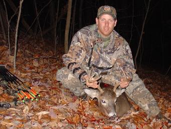 | Keith Hovland, Wadsworth, OH collected this 8 point in Muskingum County, OH. Keith stated, "This is the first year I tried the Disappear Cover Scent. In the past I’ve used estrus based scents, and have had good luck with them, although never early in the season. October 11, 2009, Ohio bow season, I became a believer in DISAPPEAR COVER SCENT". ( See Keith's complete comments on Customer Comments page ) |
